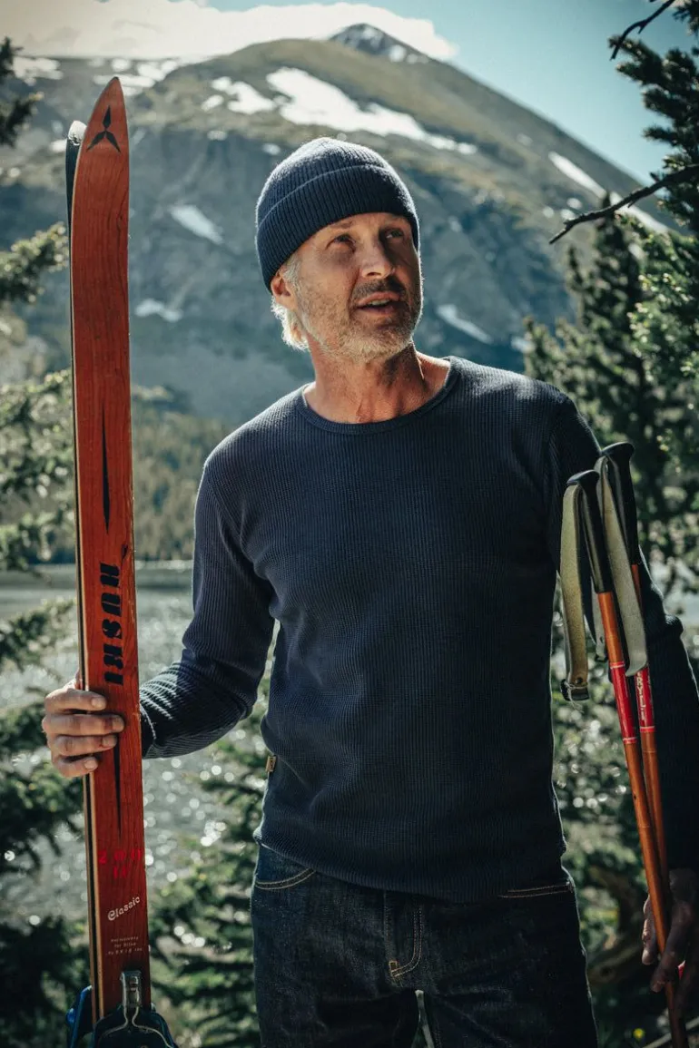 Handcrafted From Rugged 100% Cotton Waffle Fabric, Weighing A Solid 350Gsm, This Top Is A Testament To Enduring Quality And Unrivaled Comfort. Its Deep Indigo Shade And Cuffed Sleeves Conjure A Timeless Allure, Offering A Unique Take On The Classic Crew Neck.