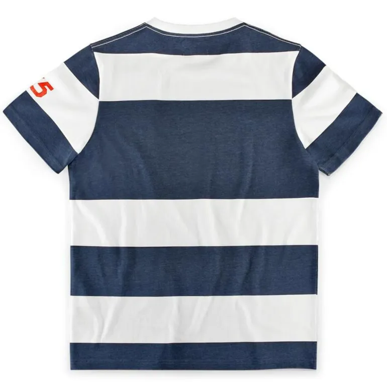 Crafted In Portugal With Meticulous Attention To Detail, This Tee Showcases A Timeless White And Blue Colourway, Capturing The Essence Of Classic Style. The Printed Indigo Stripes Add A Touch Of Sophistication, Elevating Its Overall Aesthetic. What Truly Sets It Apart Is The ’75’ Graphic Placement Print On The Sleeve, Paying Homage To A Dean’S Vintage Car And A Bygone Era.